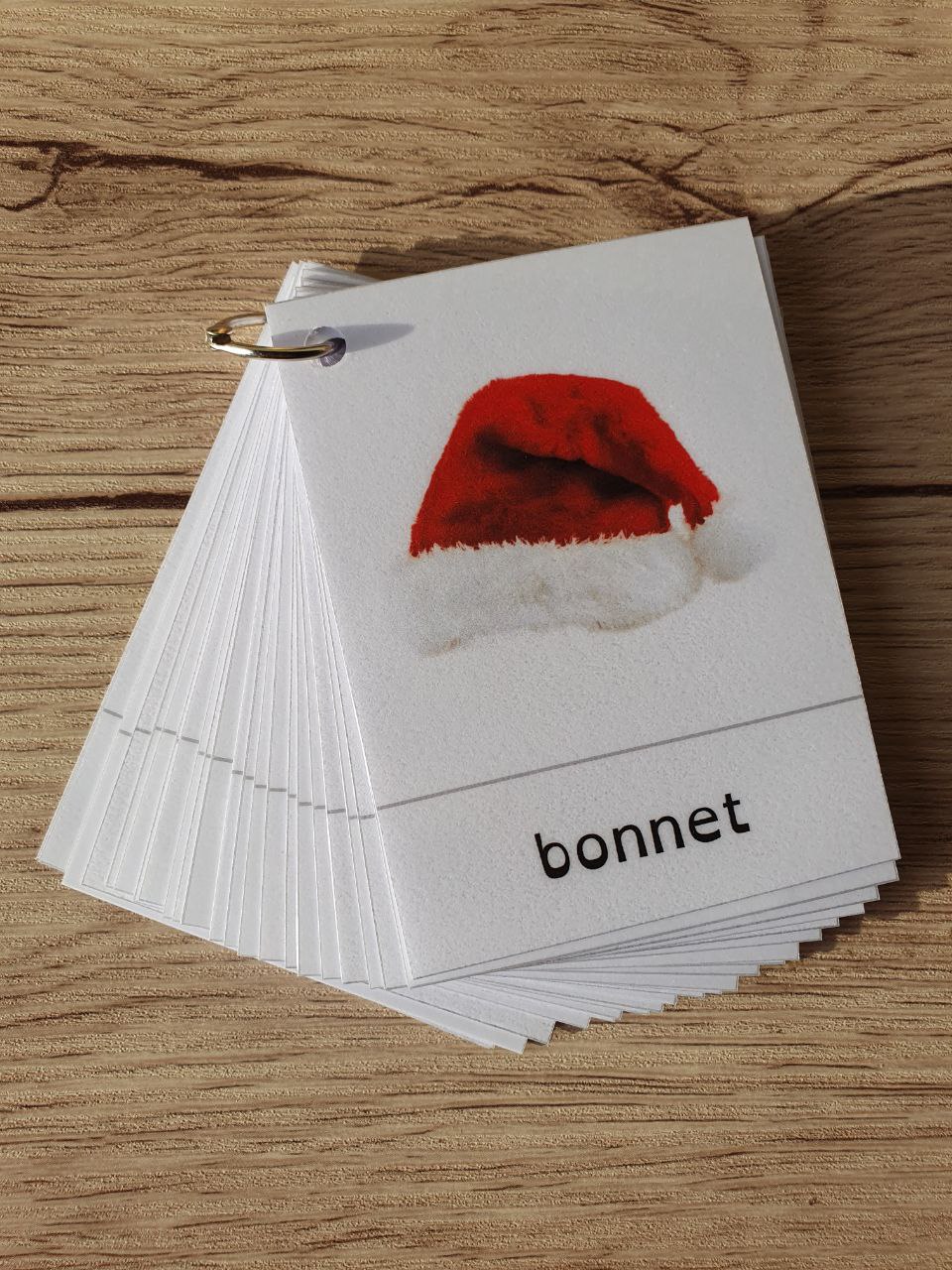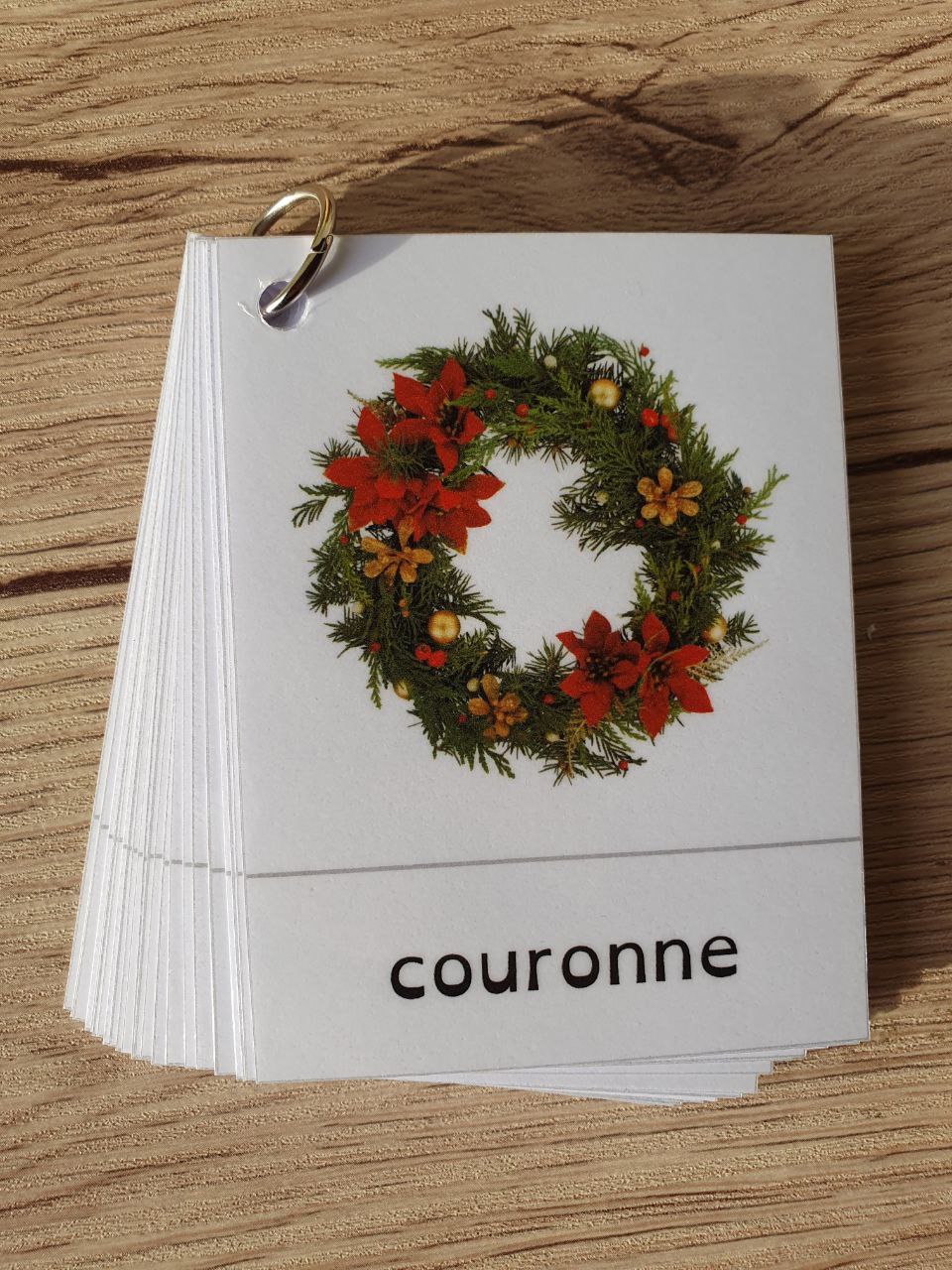 🔸 24 cartes : cadeau, sucre d’orge, bûche, bûche de Noël, traîneau, Père Noël, sapin de Noël, renne, pain d’épices, sablé, flocon de neige, guirlande, bougie, cheminée, couronne, bonhomme de neige, bonnet, lutin, cloche, chaussette, boule, gui, houx, étoile