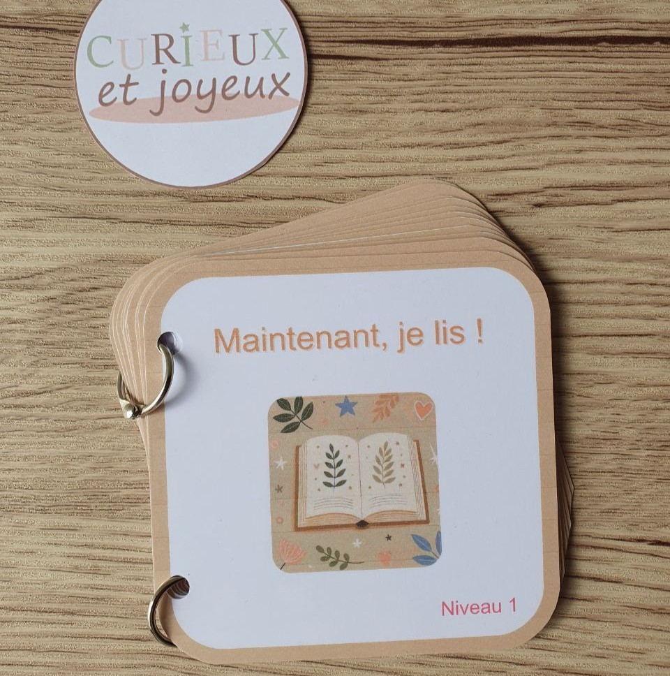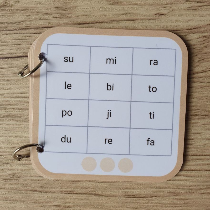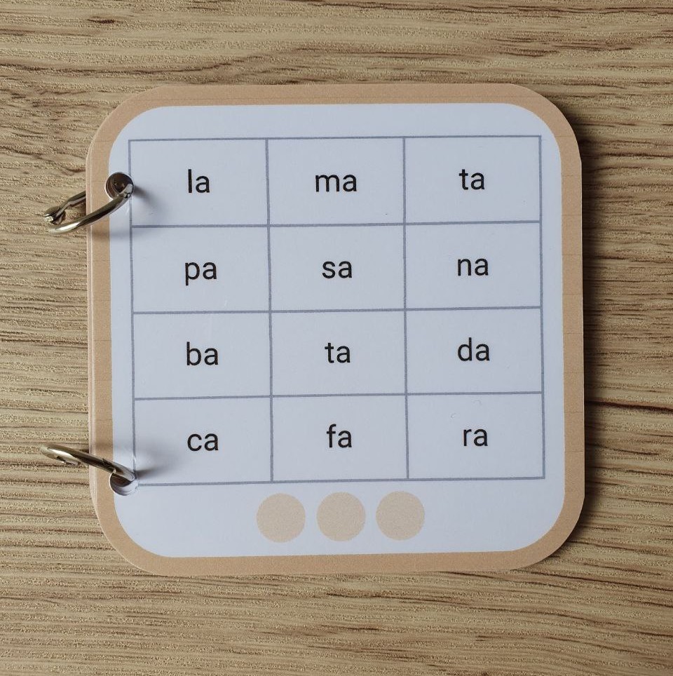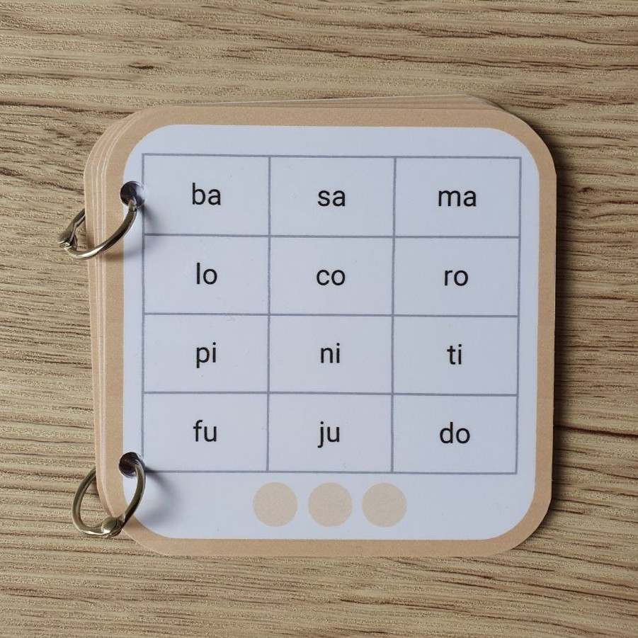 🔸 11 pages plastifiées : 1 de garde + 10 fiches de lecture 🔸 120 syllabes simples (type "ma", "to", "lu", etc.) à déchiffrer 🔸 Format mini (10 x 10 cm), parfait pour les petites mains 🔸 Relié par deux anneaux amovibles – solide et pratique 🔸 Planche de gommettes incluse pour suivre les progrès