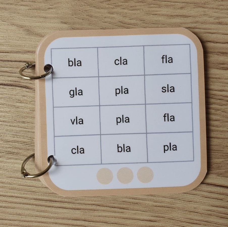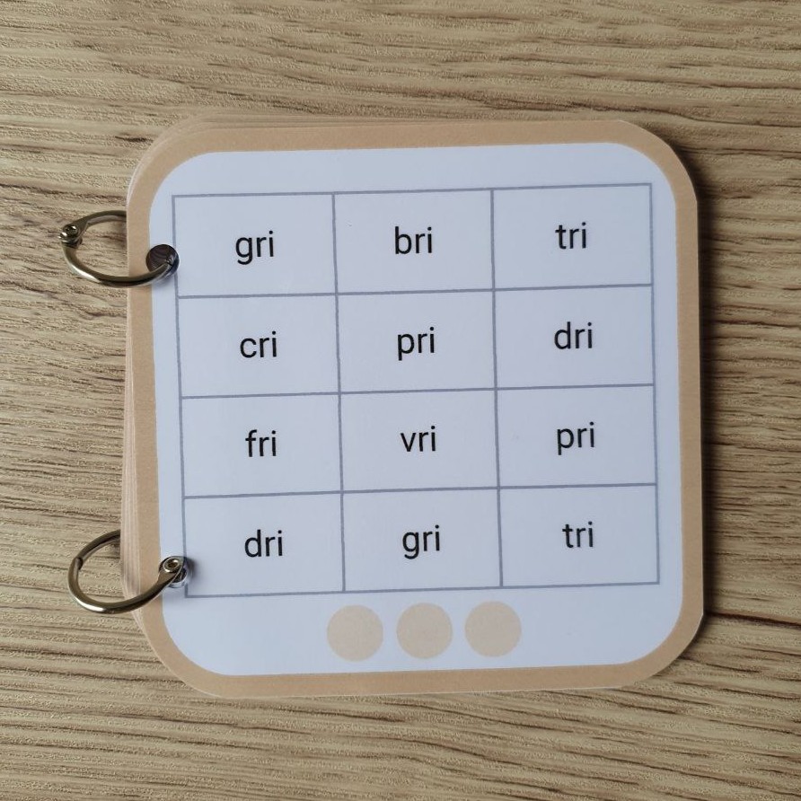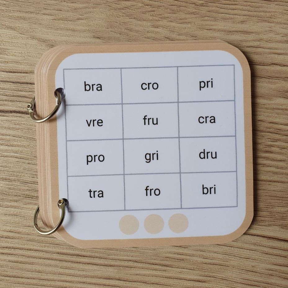 🔸 11 pages plastifiées : 1 de garde + 10 fiches de lecture 🔸 120 syllabes à 3 lettres (type "pra", "tou", "cle") à lire et relire 🔸 Format carré (10 x 10 cm), maniable et nomade 🔸 Relié par deux anneaux amovibles pour plus de solidité 🔸 Planche de gommettes incluse pour suivre les réussites
