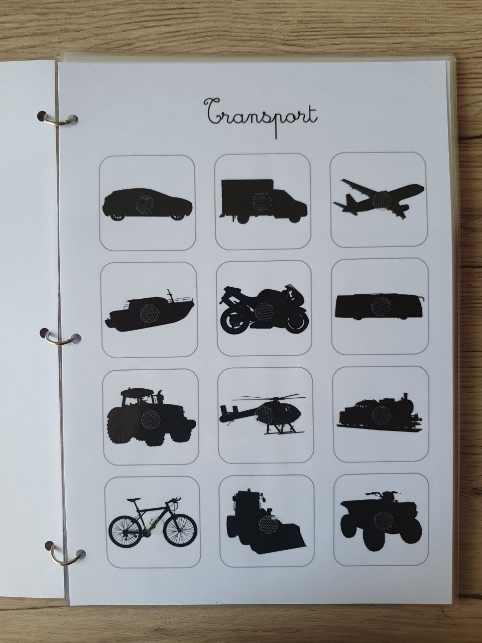 🔸 11 pages plastifiées (format 13,5 x 19,5 cm), dont page de garde 🔸 1 thématique par page : transports, animaux, objets du quotidien… 🔸 Reliure à anneaux amovibles pour une manipulation facile